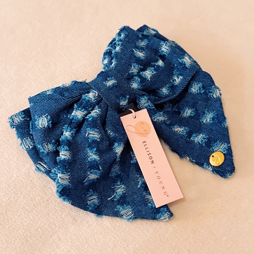 This chic 80’s Vibe Distressed Jean Bow Hair Clip adds a retro touch to any outfit. The distressed design makes it easy to dress up or down, perfect for any occasion.