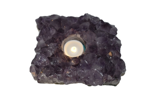 A large chunk of natural amethyst makes the perfect candle holder. This amethyst specimen is carefully drilled into to create a holder for tea lights. Watch the soft glow of the candle reflect off of the multifaceted surface of the gemstone. Perfect for creating a zen experience in your bedroom or bathroom.