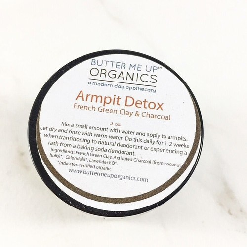 This armpit detox will help aid in the transition from any traditional deodorant including anti-antiperspirants. it is very important after using traditional deodorant for many years, especially anti-antiperspirants, which hold in the toxins that your body is trying to express. This will also help if having a reaction to a natural deodorant including baking soda. Simply put a bit in your palm, mix with a tiny bit of water or Organic Apple Cider Vinegar and spread across your armpits. Leave on for 5 to 10 minutes and do this daily for a week. The charcoal and natural detoxifying Clay will help to pull all of the toxins from under the arms which can accumulate. The calendula flowers will help to regenerate and heal the area and the lavender will heal and calm a reaction. It is very important to detoxify this area as it is very close to the lymph nodes.