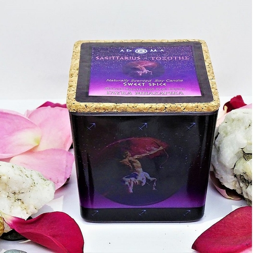 The zodiac sign of Sagittarius on the square glass comes to life when the candle is lit. When the wax melts, the glitter sparkles with the light of the flame as it releases its aroma. With a cork lid that protects the candle from dust when not in use.