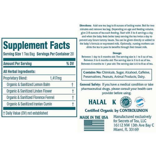 Directions: Add one tea bag to 8 ounces of boiling water. Boil for two minutes and remove tea bag. Depending on age and feeding volume, give 2-8 ounces of tea each feeding. Start with 3 to 4 servings a day and when the baby feels better keep serving the tea twice a day to prevent any future tummy issues. Tea can be given directly or added to the baby’s formula or expressed milk. Optionally, nursing mothers can drink the tea to pass its benefits through their breast milk.