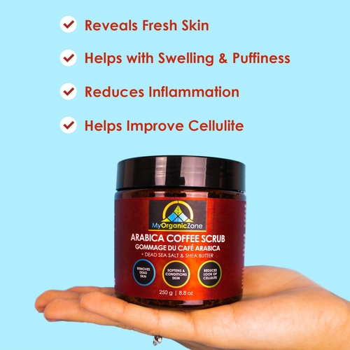 Improve the look of cellulite: Dead sea salt & arabica seed oil are organic antioxidants that work together to reduce the appearance of cellulite on the body. These cleansing & moisturizing effects help soothe, emphasize healthier skin & promote a better overall glow.