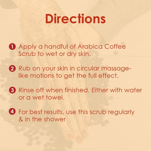 Apply a handful of Arabica Coffee Scrub to wet or dry skin. Rub on your skin in circular massage-like motions to get the full effect. Rinse off when finished. For best results, use the Arabica Coffee Scrub regularly & in the shower. For external use only.