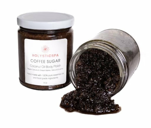 Our Coffee Sugar Scrub is made with raw wild honey, organic Jojoba oil, organic shea butter, organic coconut oil, organic coffee grounds.  The Coffee Sugar scrub is very hydrating for dry skin. Honey is also hydrating and anti-aging.