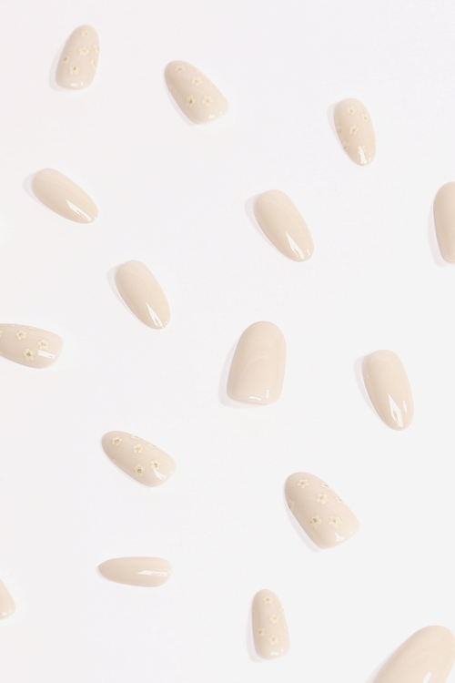 Cotton Daisy press-on nails present an ivory base graced with a delicate daisy pattern, where each flower’s center is accented with a touch of gold glitter. This design melds simplicity with a flair of sophistication, perfect for enhancing any ensemble. The subtle shimmer of gold adds a luxurious twist, ensuring these nails are not just a detail but a standout accessory.