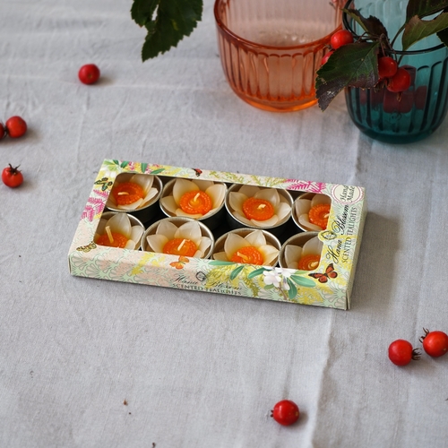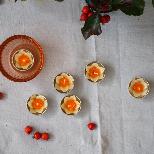Daffodil is virtually synonymous with spring. It brings you joy and fresh energy. Just like these handmade flower tealights in daffodil design. Scented with Indian jasmine a sweet and fresh fragrance which will bring joy to your home. Come in 8 daffodil tea lights in a botanic garden printed box. They can be used with any standard tea light holders. An ideal gift for birthday, home sweet home house warming party, a fabulous Christmas gift filtering and etc.
