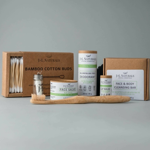 Includes: (1) Cleansing Bar, (1) Face Salve, (1) Lip Balm, (1) Deodorant, (1) Bamboo Toothbrush, (1) Floss, (1) Set of Cotton Buds