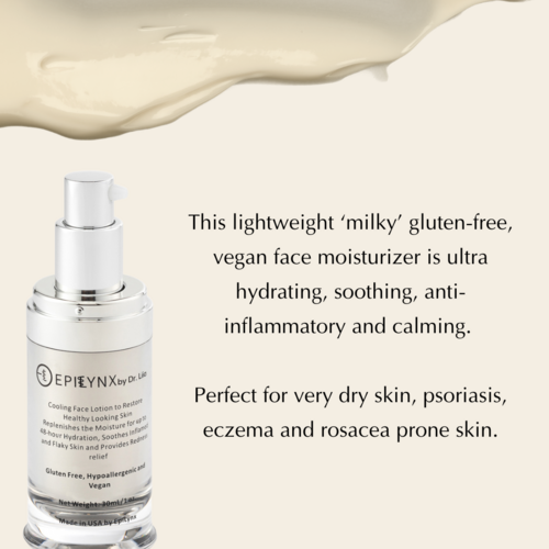 This lightweight ‘milky’ gluten-free, vegan face moisturizer is ultra hydrating, soothing, anti-inflammatory and calming. Use in the morning and evening daily for intense moisture skincare routine. This face moisturizer is great for very dry skin, psoriasis prone skin, eczema and rosacea prone skin and sensitive skin.