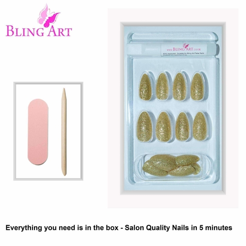 Aurelia Gold – Almond Stiletto Long – 24 Nails, Glue, Nail File & Cuticle Stick.