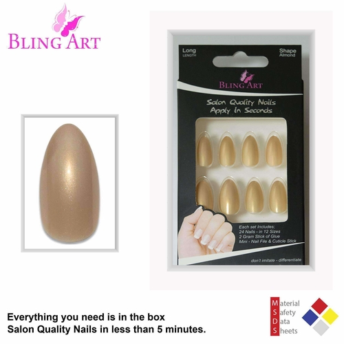 Exude luxury and class with our stiletto gold nail and make everything you touch turn to gold! Finished with a beautiful pearlescent shimmer, and infused with shimmer, these luxurious almond stilettos will add a touch of pure class whenever you accessorize with them.