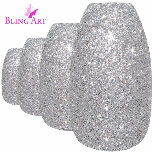 Ariana Silver – Ballerina Coffin Long – 24 Fake Acrylic Nail Tips, Free Glue, Nail File & Cuticle Stick.