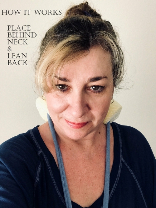 Easy to use. Place cushion behind your neck/base of skull. Hold/maneuver with fabric side sleeves for positioning and comfort. The cushion can be placed anywhere, in front, behind or on top of the sink edge. Simply tie around your neck like a travel pillow/scarf or hold side sleeves with your hands and RELAX.