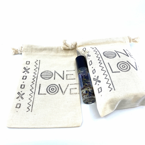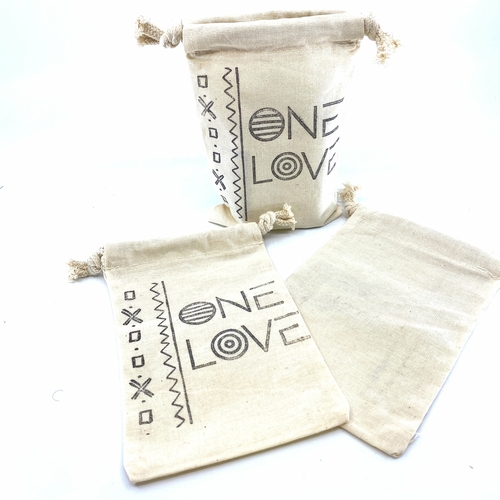 Hand Stamped, One Love, Cotton Drawstring Pouches 4″ x 6″ reminds us that we are all interconnected. Each drawstring pouch is hand stamped with eco-friendly pigment ink.