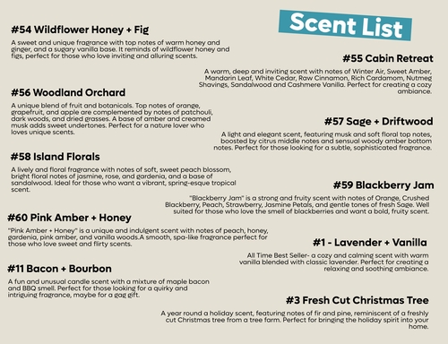 Scent | #1 Lavender And Vanilla, #54 Wildflower Honey + Fig, #55 Cabin Retreat, #11 Bacon + Bourbon, #57 Sage + Driftwood, #58 Island Florals, #56 Woodland Orchard, #59 Blackberry Jam, #60 Pink Amber + Honey, #3 Fresh Cut Christmas Tree |