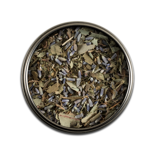 At-home nasal decongestant steam ingredients. Hand blended apothecary item housed in 2oz silver tin with screw top lid.