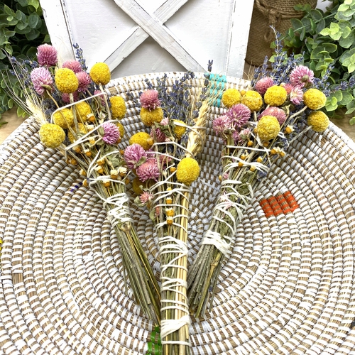 Each floral wand contains : lavender, wheat, craspedia (billy balls), pink global amaranths, and star daisies.