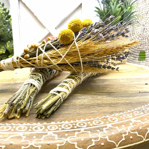 The Lavender & Wheat, Floral Wand, Smudge Stick, 6” brings warm positive energy into your home. It also helps open the heart chakra by releasing your fears while calming the mind and helping to protect the spirit. The accompanying dried flowers remind us of the abundance of spring and summer.