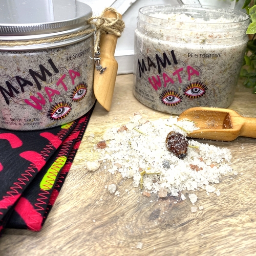 The Mami Wata, Ritual Bath Salts with Rosehips & Rosemary, 10 oz, honors the water spirit with a fragranced, purifying and restorative experience. Each 10 oz jar is handmade with himalayan pink salt, dead sea salt, and black lava salt, real dried rosehips and moroccan rosemary, plant-based oils, and non-toxic fragrance oils.