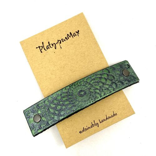 This lightweight, metallic emerald leather hair barrette features an embossed textured of vintage lace in a mandala-like pattern. Brilliant painted surface finish bring out the texture with a truly unique tone of green silver sheen. It makes a great gift for anyone with long hair and a vintage vibe as a nice practical alternative to jewelry.