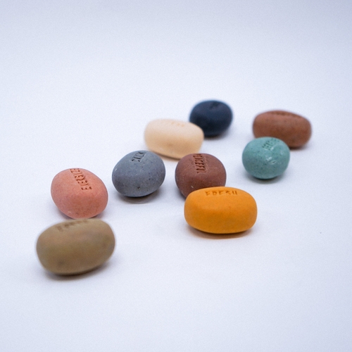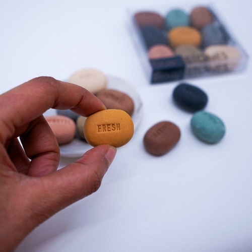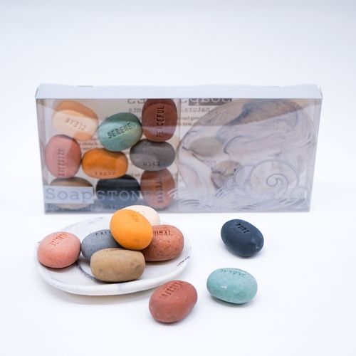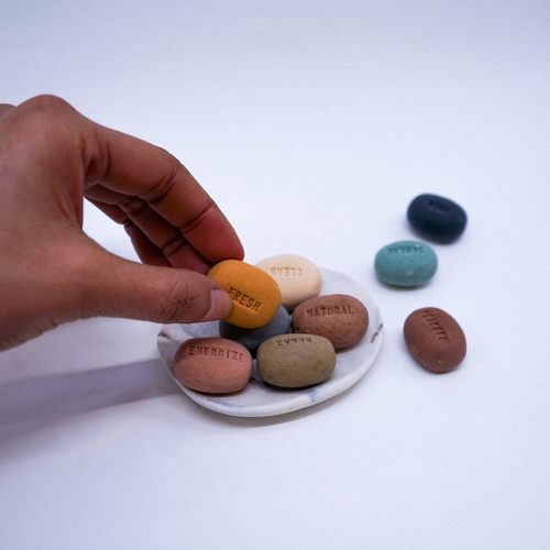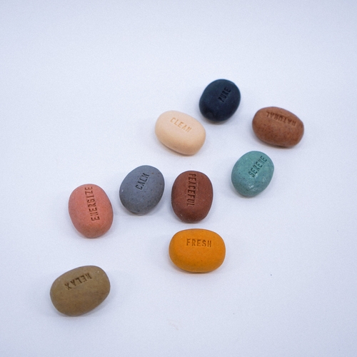 These handmade soaps in pebble design can speak your mood out. Each soap has a mood word on such as calm, fresh, serene, pure, relax, energize. Come in assorted colours. Soaps are purely handmade with natural ingredients. White porcelain dish with a dark grey marble effect is handmade giving its unique character on its own. Ideal a great gift for any occasions and home use.