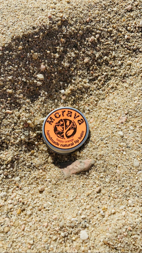 Caring balm for cracked lips with shea and cocoa butter with scent of sweet orange . While our lip balm is stimulating good mood and inspiring your emotions, it nourishes, protects and hydrates your lips.
