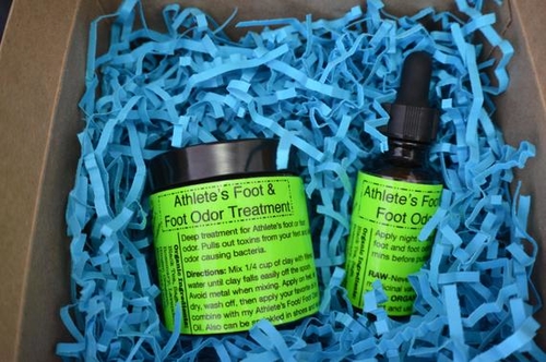 Directions: For the deepest Athlete’s foot treatment out there mix 1/4 cup of clay with filtered water until clay falls easily off the spoon. Avoid using metal when mixing since metal decreases the clays pulling ability. Apply on feet, let dry completely, wash off, then apply your favorite antibacterial oil, like Coconut or Olive Oil, or combine with my Athlete’s Foot/ Foot Odor Oil. Also can be sprinkled in shoes and socks.