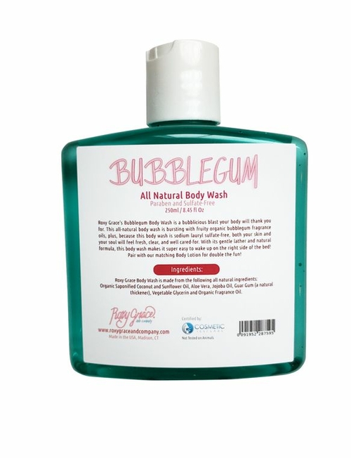 Bubble Gum Body Wash 8.45 Ounces Roxy Grace’s Bubble gum Body Wash is a bubblicious blast your body will thank you for. This organic body wash is bursting with fruity organic bubblegum fragrance oils, plus, because this body wash is sodium lauryl sulfate-free, both your skin and your soul will feel fresh, clear, and well cared-for. With its gentle lather and natural formula, this body wash makes it super easy to wake up on the right side of the bed! Pair with our matching Body Lotion for double the fun! Organic Body Wash Bubble gum Body WashAll Natural Bubble Gum Body Wash Gentle Body Wash Kids Body Wash Sensitive Skin Cleanser Shower Gel Paraben Free SLS Free