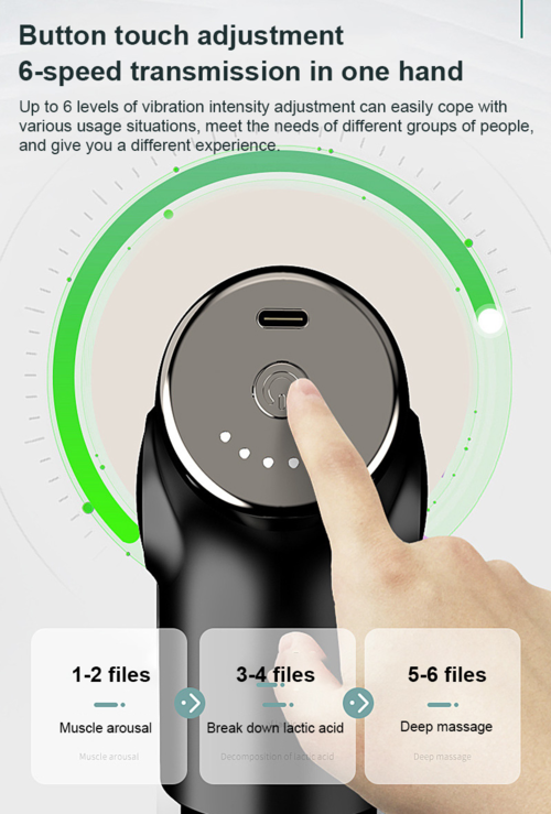 Key touch adjustment, palm control 6 gear speed change; up to 6 gear vibration intensity adjustment, can easily cope with various use conditions, to meet the needs of different groups of people.