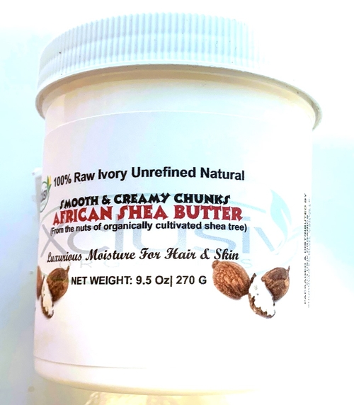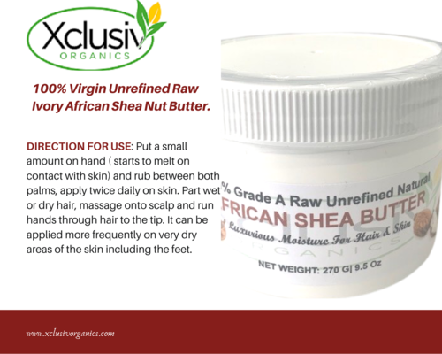 Xclusiv Organics African Shea butter is imported from Ghana in West Africa. It contains high concentrations of fatty acids and anti-oxidants that mop up free radicals that cause skin aging. It is an ideal ingredient for deeply moisturizing and softening skin. Raw Shea butter also has anti-inflammatory and healing properties, making it very useful for skin blemishes including acne. Using raw organic Shea butter from Xclusiv Organics on your body, especially your face, can condition, tone, soothe and give your skin a luxuriously smooth velvety feel.Â
