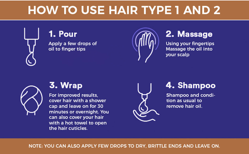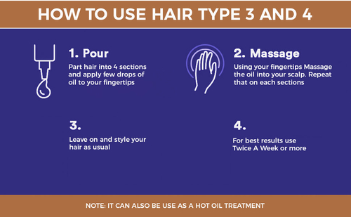 Massage the desired amount of oil into the scalp gently with your fingers. Divide your hair into four sections and apply the oil from root to tips for maximum shine and thickness. Comb or brush the oil into your hair, leaving it in without washing it out. For optimal results, try the LCO METHOD (Leave-in, Cream, and Oil) or LOC METHOD (Leave-in, Oil, and Cream).
