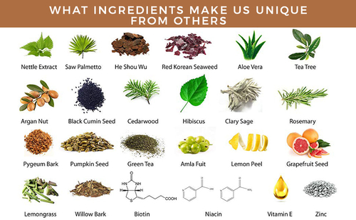 (Oryza Sativa) Black Rice Powder, (Nigella Sativa) Black Cumin Seed Powder, (Bacopa Monnieri) Brahmi Powder, (Phyllanthus Emblica) Amla Powder, (Oleifera) Moringa Powder, (Methylsulfonylmethane) MSM Powder, (Equisetum) Horsetail Herb, (Persea Americana) Avocado Oil, (Olea Europaea) Olive Oil, (Prunus Amygalus) Castor Oil, (Azadirachta Indica) Organic Neem Oil, (Sarenoa repens) Saw Palmento Powder, (Prunus africana) Pygeum Powder, Biotin Powder, (Rosmarinus Officinalis) Rosemary Herb, (Lavandula Angustifolia) Lavender Herb, (Rosmarinus Officinalis) Rosemary Essential Oil, (Melaleuca Alternifolia) Tea Essential Tree Oil, (Mentha Piperita) Peppermint Essential Oil, (Tocopherol) Vitamin E Oil, (Jasminum Plumeria) Natural Jasmine Oil, And Faith
