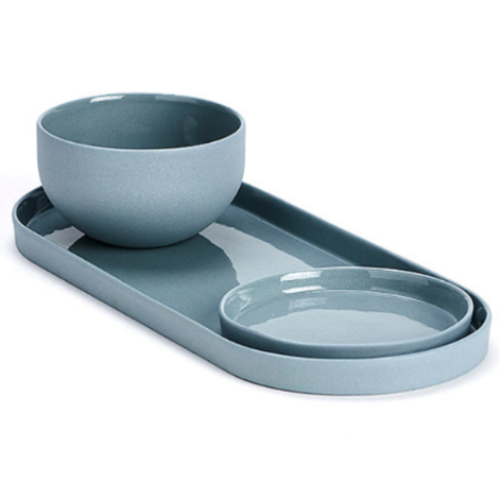 The TRI Serving set is available in three beautiful colors. The bowl, tray and container are all glazed on the inside with a smooth matte finish on the outside.