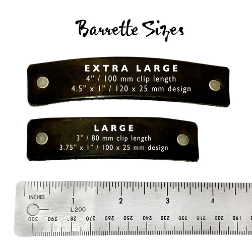 Or should we say, crafts-woman-ship? All barrettes are handmade, originally created for their designers’ own long hair, with consideration not only for beauty, but also functionality, comfort and durability using eco-friendly materials and practices. The clips themselves are large, high quality, sturdy French-style metal barrette clips with tension bar. The leather is very securely attached to the clip with metal rivets that will be nearly impossible to remove.