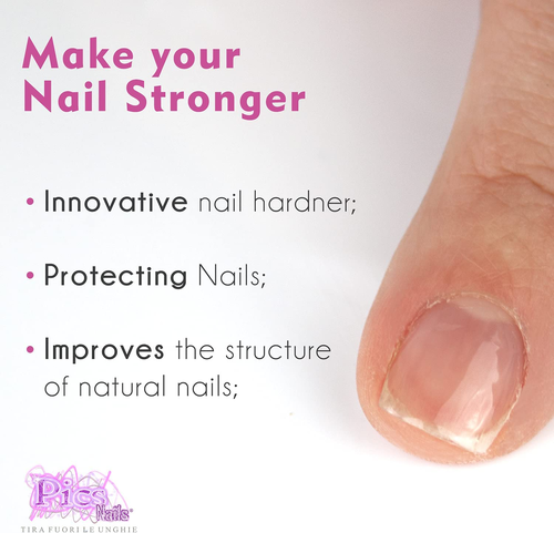 Smalto Indurente per Unghie Fragili, Trattamento per unghie dalla formulazione speciale indicato per unghie molto deboli, fragili o visibilmente stressate. L’Indurente per Unghie Pics Nails può essere utilizzato al posto della Base Coat come base per Smalto oppure Applicato da solo come Smalto Trasparente. Consigliamo di sostituitlo due/ tre volte alla settimana; essendo un Trattamento Curativo necessita di alcune settimane per agire in Profondità nella Lamina Ungueale. Suggeriamo l’applicazione dell’ indurente per Unghie 1 volta al giorno con uno o due strati di applicazione, continuando con l’applicazione fino all’ottenimento di un risultato soddisfacente delle proprie unghie. Può essere usato come una Base Coat prima dell’applicazione dello smalto colorato oppure da solo come Smalto Trasparente, grazie al suo colore ambrato trasparente ed al suo finish lucido. Si rimuove con il Solvente Senza o con Acetone. La sua asciugatura è rapida con i suoi 2 min. di asciugatura completa
