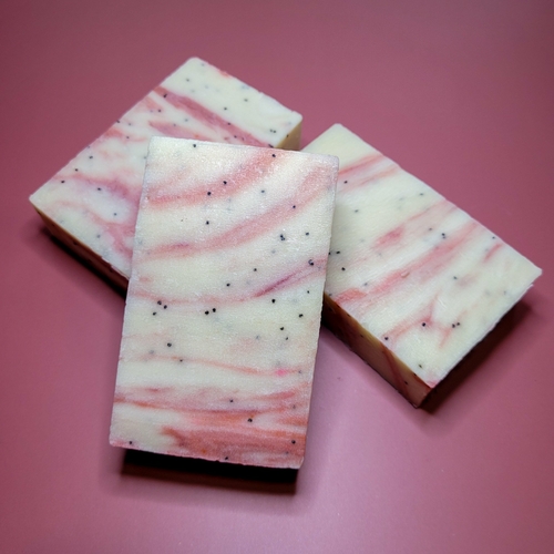 Ingredients: olive oil, coconut oil, grapeseed oil, sustainably sourced palm kernel oil, sodium hydroxide, water, cocoa butter, shea butter, goatmilk, fragrance oil, oxide, poppyseeds.