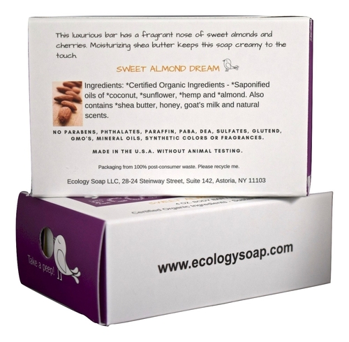 *Certified Organic Ingredients: Saponified oils of *coconut, *sunflower, *hemp and *almond. Also contains *shea butter, honey, goat's milk and natural scents.