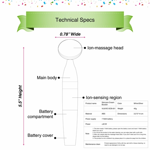 Important informationIndications• Improves aging signs, furrow lines, fine line wrinkles, age spots, firm skin, tightens skin deeply hydrates and moisturizes. Legal Disclaimer• If you have any skin infection on the face area, its recommended to consult the doctor before using this device. Directions• Insert 1*AAA battery to operate. |