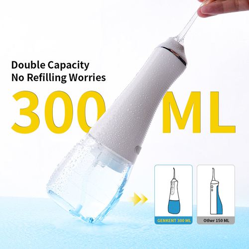 Enhance your smile and safeguard your gums with the GENKENT Cordless Water Flosser. This innovative dental tool ensures optimal oral health with its portable design and advanced features. With a 300ML water capacity detachable tank boasting, this flosser effortlessly eliminates debris from between teeth and along the gum line, promoting gum health and overall oral hygiene. Featuring 3 modes and 5 precision cleaning jet tips, this cordless water flosser caters to diverse oral care needs. Its sleek, compact design not only makes it perfect for travel but also saves space compared to bulkier countertop models. Additionally, the high-capacity 2000mAh battery guarantees up to 40 days of usage on a single 4-hour charge, ensuring uninterrupted dental care. With just 3 minutes a day, achieve a brighter smile and healthier gums with the GENKENT Water Flosser â the ultimate solution for efficient and convenient oral hygiene.