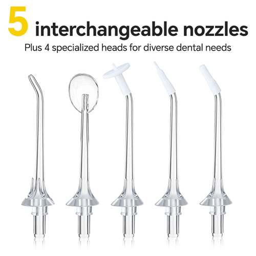 - ã5 Jet Tips & 360°Rotatableã5 Pcs multifunctional jet nozzles for your different needs and Long-term use. The 360° rotatable nozzle design can clean teeth comprehensively from multiple angles, and prevents tooth decay, dental plaque, dental calculus, gingival bleeding and dental hypersensitivity. Suitable for whole family members.