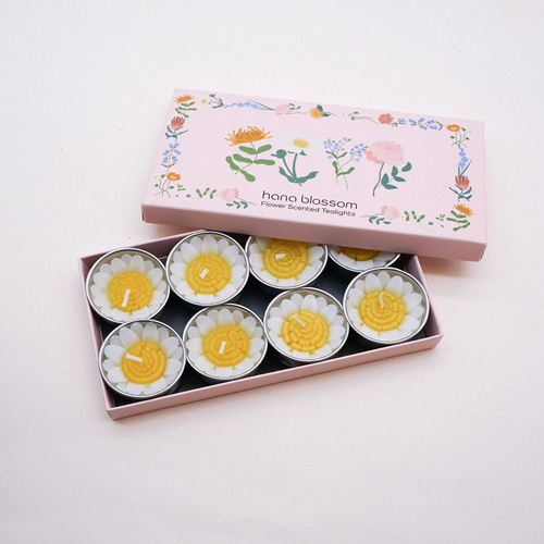 Sweet and fresh like a daisy would be the words to represent these handmade daisy scented tealights. Each single little petals is hand cut and then combine them together to form a flower shape. Scented with Neroli essential oil a sweet, honeyed and relaxing which will bring joy to your home. Come in 8 daisy tea lights in a botanic garden printed box. They can fit with any standard tea light holders. They are beautiful gift for birthday, home sweet home house warming party, a fabulous Christmas gift filtering and etc.